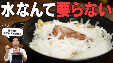 新玉ねぎの水分だけで特大の塩豚の塊を煮込む。オニオンスープも一緒にできる!一石二鳥の革命的レシピです。