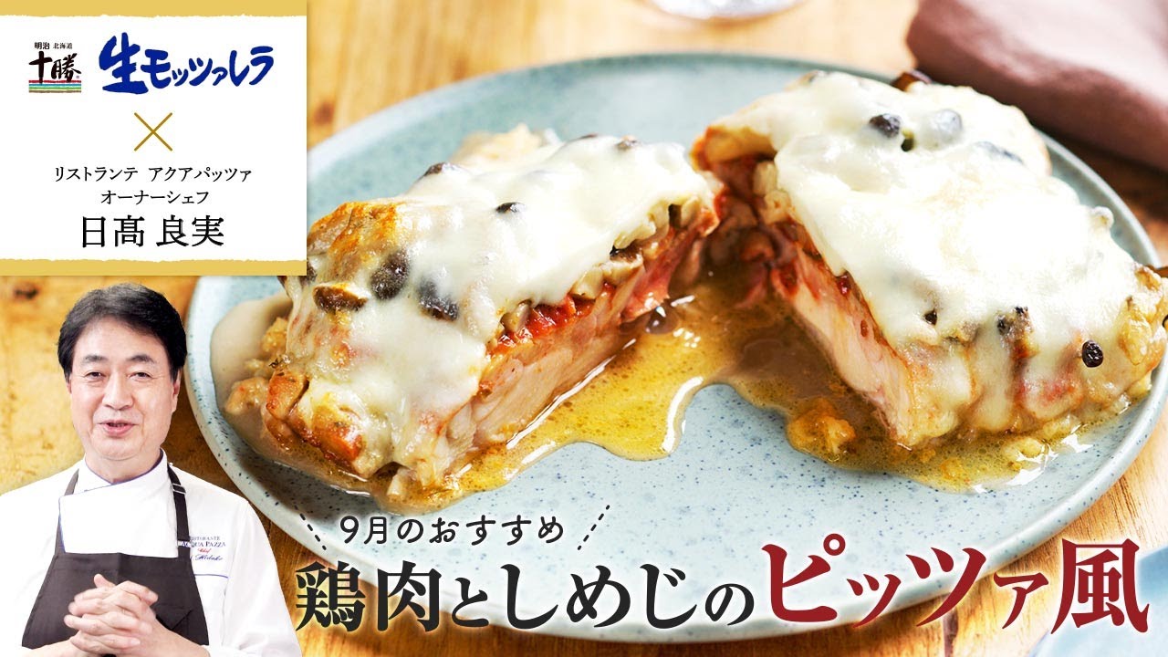 【シェフのこだわりレシピ】明治生モッツァレラの鶏肉としめじのピッツァ風